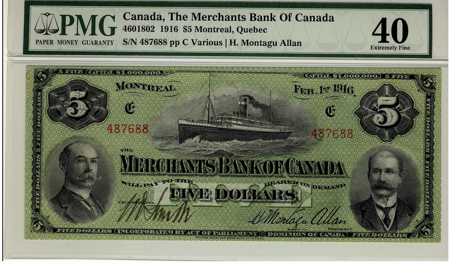 The Merchants Bank of Canada, 1916 $5 #487688,CH-460-18-02, PMG EF40. Rare this nice. A bright and attractive example.
