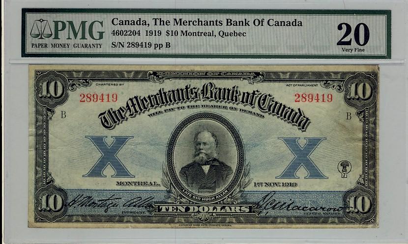 The Merchants Bank of Canada, 1919 $10 #289419, CH-460-22-04, PMG VF20, Only one example finer.