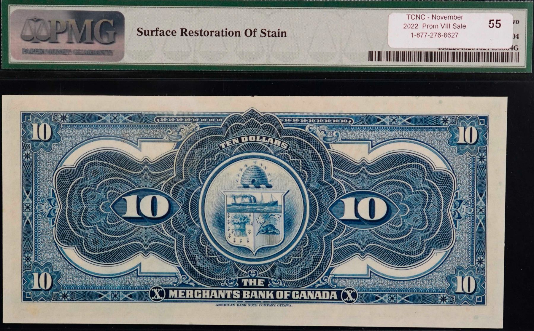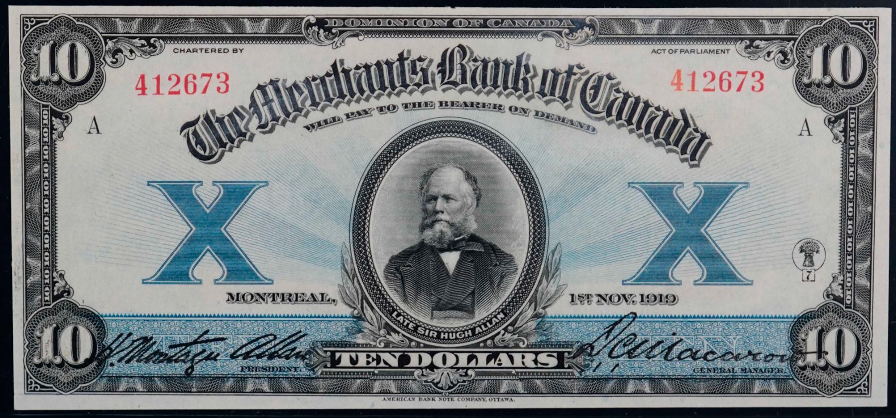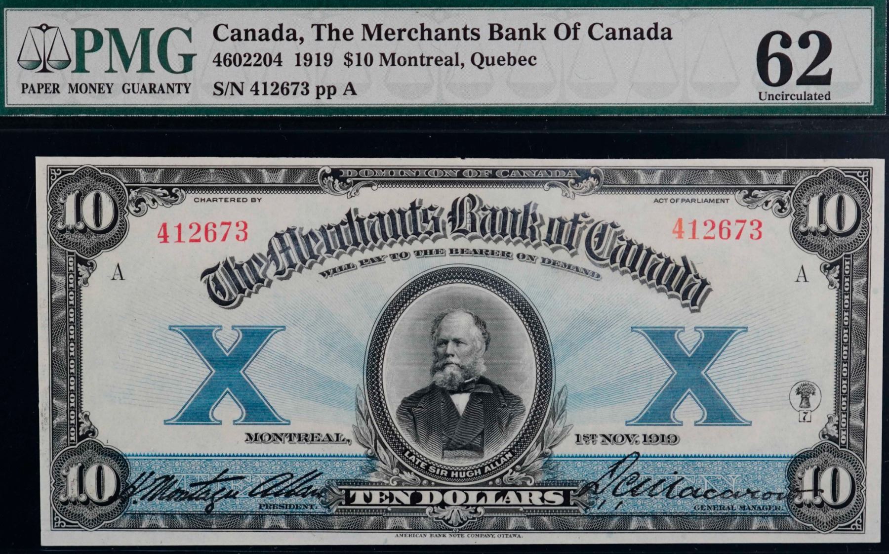 The Merchants Bank of Canada; 1919 $10 #412673 CH-460-22-04, PMG Choice Uncirculated-62. The note is bright with superb centering and vibrant colours. A Spectacular full bodied and full coloured issue. A must for the High end collector or investor. The best example seen and handled by TCNC.