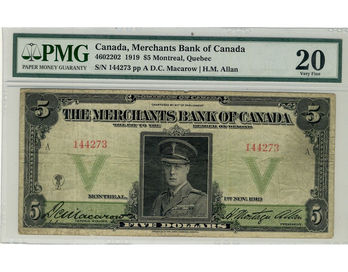 The Merchants Bank of Canada; 1919 $5 #144273 CH-460-22-02 PMG VF20.  An attractive example.