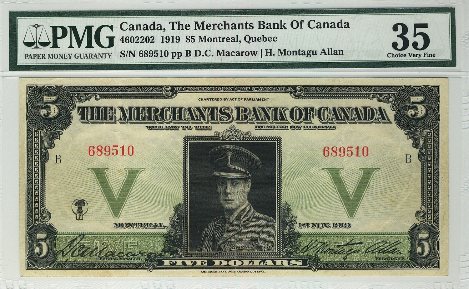 The Merchants Bank of Canada 1919 $5 689510 CH-460-22-02 PMG VF35. Attractive and scarce in this condition.