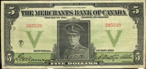 The Merchants Bank of Canada 1919 $5 CH460-22-02 No.295329. Bright VF to VF+ example. Nice portrait of the "PRINCE of WHALES"