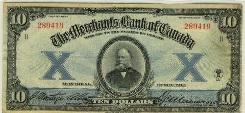 The Merchants Bank of Canada 460-22-04 1919 $10 VF. Very scarce note and seldom offered.