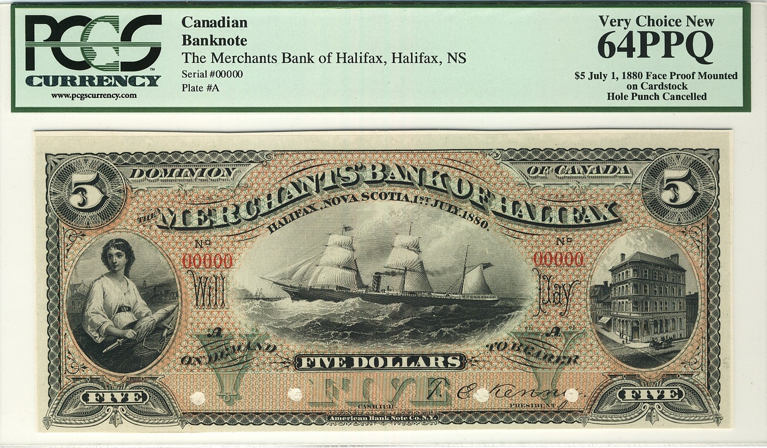 The Merchants Bank of Halifax 1880 $5 CH-465-20-02P Face and Back, PCGS UNC64PPQ and UNC66PPQ for Back,