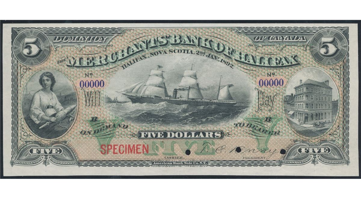 The Merchants Bank of Halifax 1892 $5 #00000, CH-465-20-06s PMG UNC64EPQ.