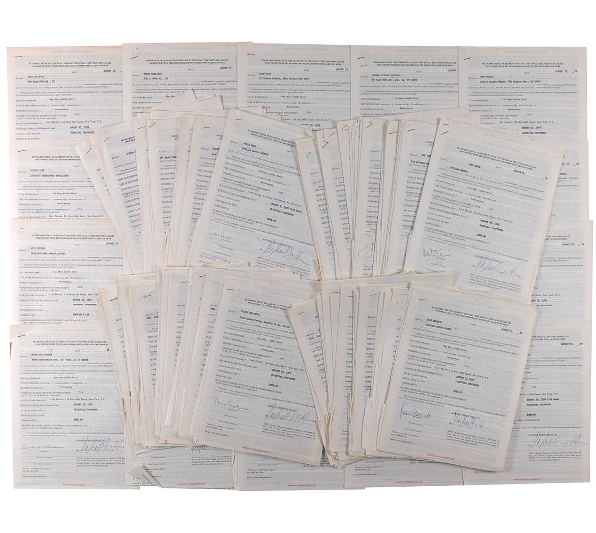 Archive of approximately 145 standard AFTRA contracts for appearances on The Merv Griffin Show, each one page, 8.5 x 11, dated August 1970. Highlights include: Al Capp, Carroll Baker, George Jessel, Jake LaMotta, Elke Somer, Rocky Graziano, Walter Cronkite, Mel Torme, Julie Newmar, and Dick Gregory. In overall fine condition, with expected document wear.