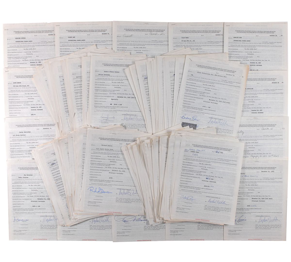 Archive of approximately 148 standard AFTRA contracts for appearances on The Merv Griffin Show, each one page, 8.5 x 11, dated December 1969. Highlights include: Lorne Greene, Ernest Borgnine, Barbara Eden, Glen Campbell, Diane Keaton, Melanie, Angie Dickinson, Elke Somer, Mickey Rooney, and Richard Dawson. In overall fine condition, with expected document wear.