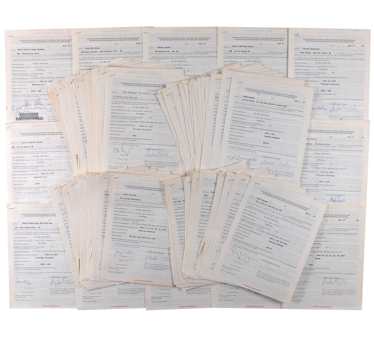 Archive of approximately 135 standard AFTRA contracts for appearances on The Merv Griffin Show, each one page, 8.5 x 11, dated June 1970. Highlights include: George Carlin, Lorne Greene, Liza Minnelli, Tony Randall, Angie Dickinson, Al Unser, Joan Baez, Eli Wallach, Rudy Vallee, Janet Leigh, Rocky Graziano, Mickey Rooney, George Jessel, Ricardo Montalban, Ozzie and Harriet Nelson, Raquel Welch, Doris Day, Chuck Conners, Otto Preminger, Jacqueline Bisset, Joan Blondell, Ursula Andress, and Tony Martin. In overall fine condition, with expected document wear.