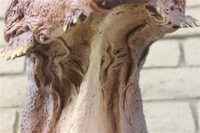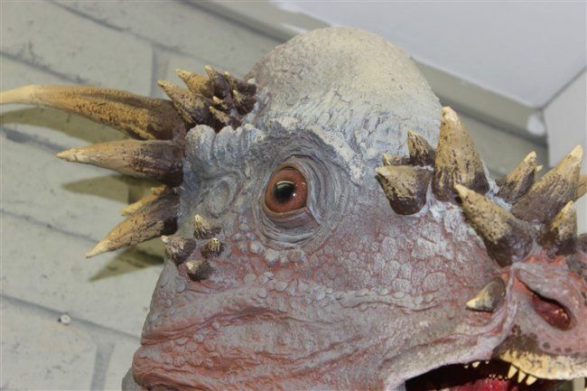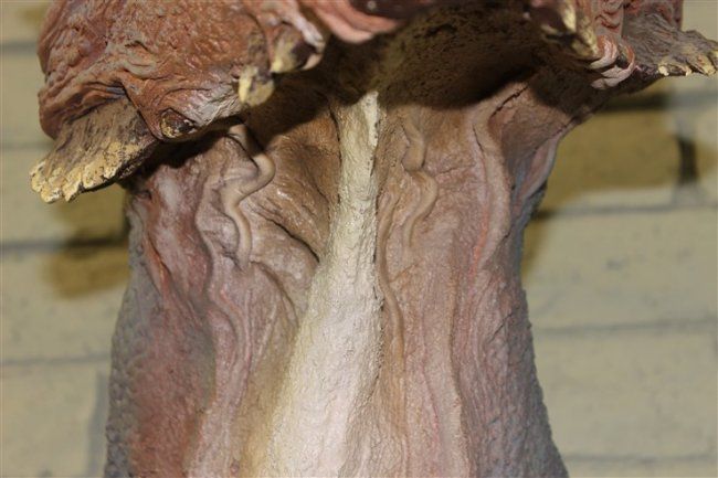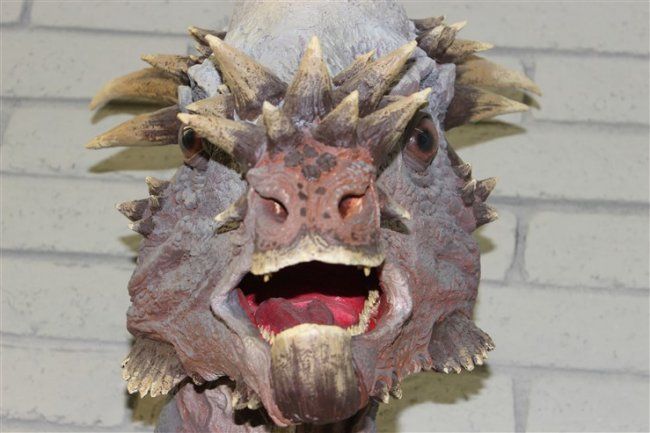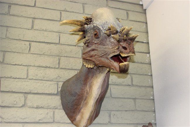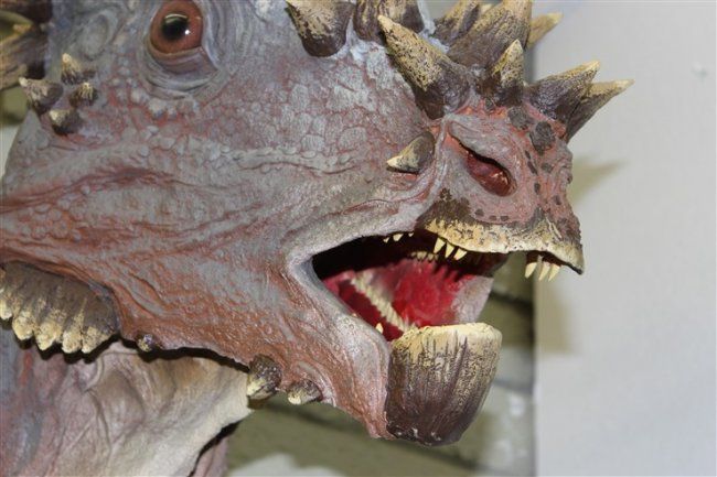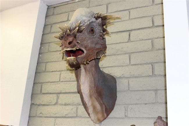 THE HEAD- Sandy is a full sized representation of what the dinosaur looked like alive. The process starts with an exact cast duplicate of the real skull. A special clay is used to sculpt the muscles skin and other details. The artists knowledge and skills produce a very good likeness of something that hasnt lsived for 67 million years .