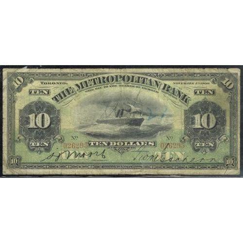The Metropolitan Bank, $10 1909 CH-485-10-14, 026295 about Fine. Light crayon mark but not distracting at all. A very rare and seldom seen banknote.