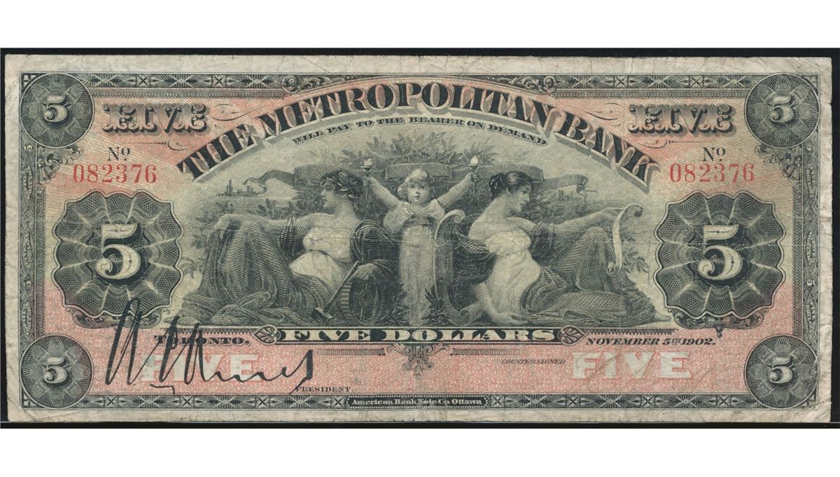 The Metropolitan Bank of Canada 1902 $5 #082376, CH-485-10-02, Fine+ example. Scarce Ames signature. Only 3 examples known. Worth a premium bid.