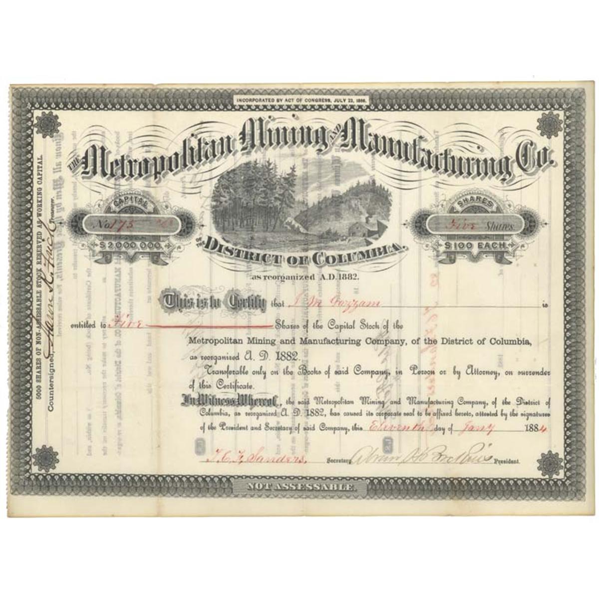 1884, District of Columbia. Stock certificate for 5 shares. Black. Vignette of a mining camp at top center. Light age toning. Uncancelled and fine.