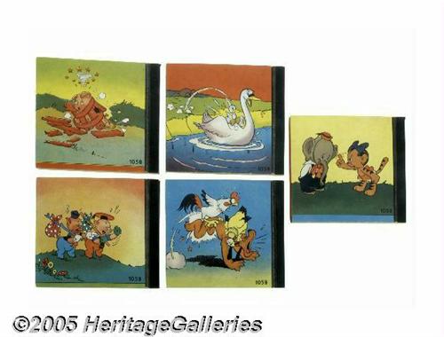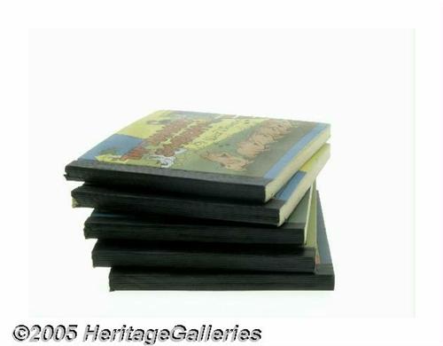 <B>The Mickey Mouse Box (Whitman, 1939).</B></I> Published by Whitman in 1939, the individual volumes featured in this boxed set occasionally surface -- but, due in large part to the inexpensive pulp stock used for the interior pages, locating sharp copies remains a challenge. Only the most advanced Disney collectors are aware that these five volumes -- <B>Timid Elmer</B></I>, <B>Mother Pluto</B></I>, <B>The Ugly Duckling</B></I>, <B>The Practical Pic</B></I>, and <B>The Farmyard Symphony</B></I> -- were also issued by Whitman in a boxed edition. The books themselves are just about as close to Mint condition as you'll ever see. <B>The Mickey Mouse Box</B></I> housing the books is so scarce as to be virtually non-existent. This one is complete - no fading, all corners intact, with no taping. There is some light spotting, foxing, and wear to the extremities. Truly exceptional - this is the only one we've ever seen. <I>From the Larry Jacobs Collection.</B></I>