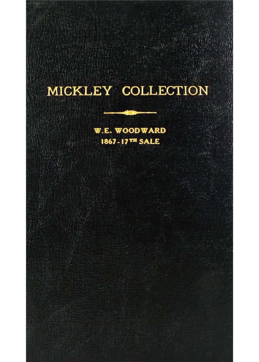 Woodward, W. Elliot. CATALOGUE OF THE NUMISMATIC COLLECTION FORMED BY JOSEPH J. MICKLEY, ESQ., OF PHILADELPHIA... New York, Oct. 28-Nov. 2, 1867. 8vo, later black textured cloth, gilt. 196 pages; 3349 lots. Hand-priced in ink. Final leaf chipped and repaired, affecting three lines of text. Very good. Quite scarce, especially fully priced. Adams calls this "Perhaps the greatest U.S. collection," a superlative that seems entirely justified. Woodward's tenth and final Semi-Annual Sale, the Mickley auction was followed by an 11-year absence of Woodward from the numismatic scene (the two catalogues in his series during this period having been catalogued by Strobridge). Perhaps he felt that nothing could surpass the Mickley collection: an understandable feeling. The sale featured astounding rarities and brought very strong prices (Attinelli states that the $750 brought by the 1804 dollar was "Probably the highest sum ever paid in this country for a single coin"). Adams 17 (A+ overall, A in large cents, half cents, colonials, medals, literature, patterns, proofs, early silver, Washington, comments and British). Attinelli 48-49. Davis 1158. The flaw on the final leaf affects three words only of the catalogue (and a few words of the ad on the following page).