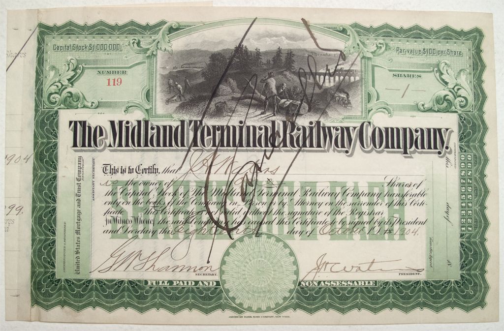 Stock #119 for 1 share to JH Waters for 1904. Signed by president JH Waters. Cancelled Vignette is a train going over a bridge, lumbering and mining. Railroad was incorporated in 1892 in the Cripple Creek area.