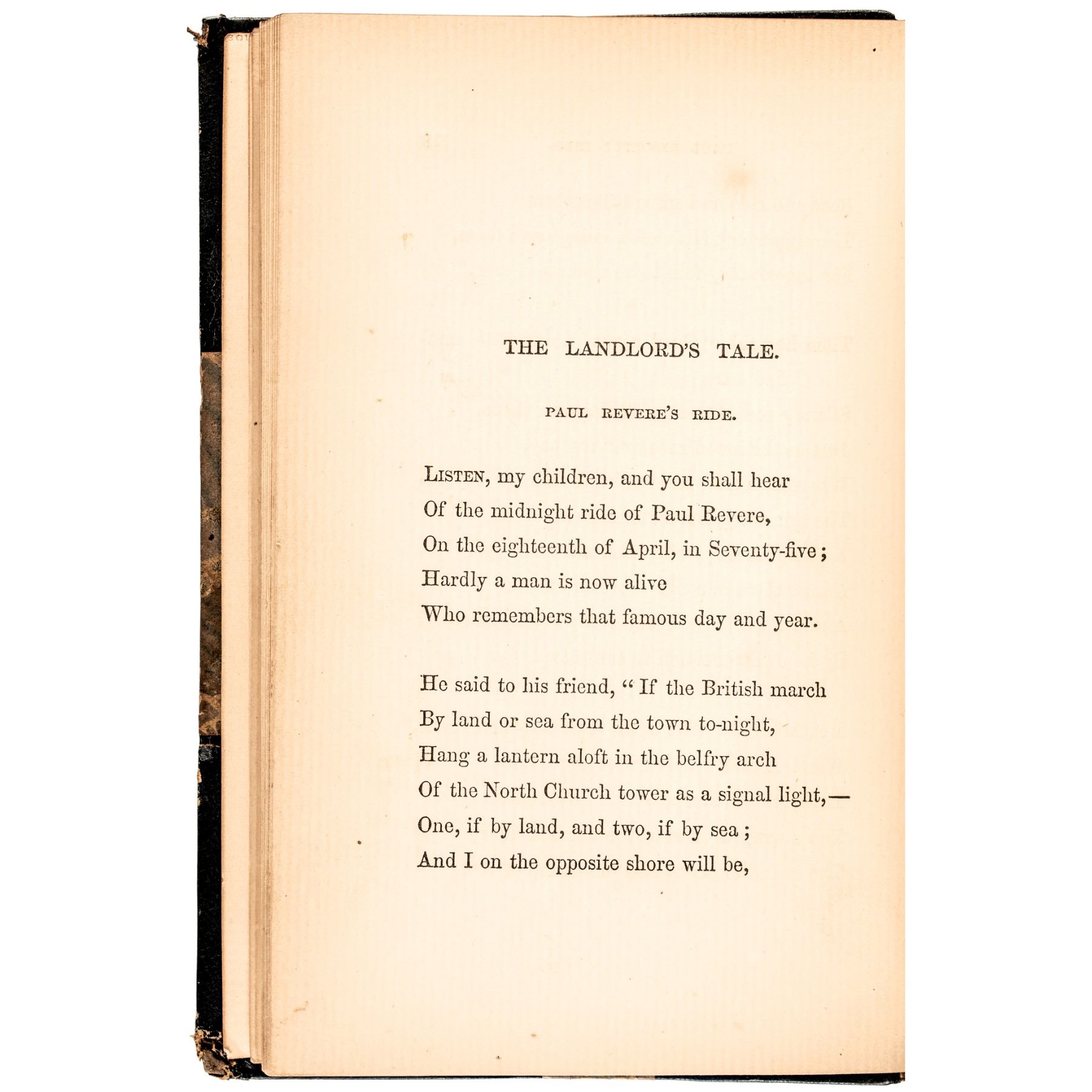 First Edition, published in 1863. The poems included in this book are told to a group of adults in the tavern of the Wayside Inn in Sudbury, Massachusetts by the landlord of the establishment. Contains Longfellow's most enduring poem titled: “The Midnight Ride of Paul Revere” on page 18, where it is titled “The Landlord’s Tale: Paul Revere’s Ride.”
