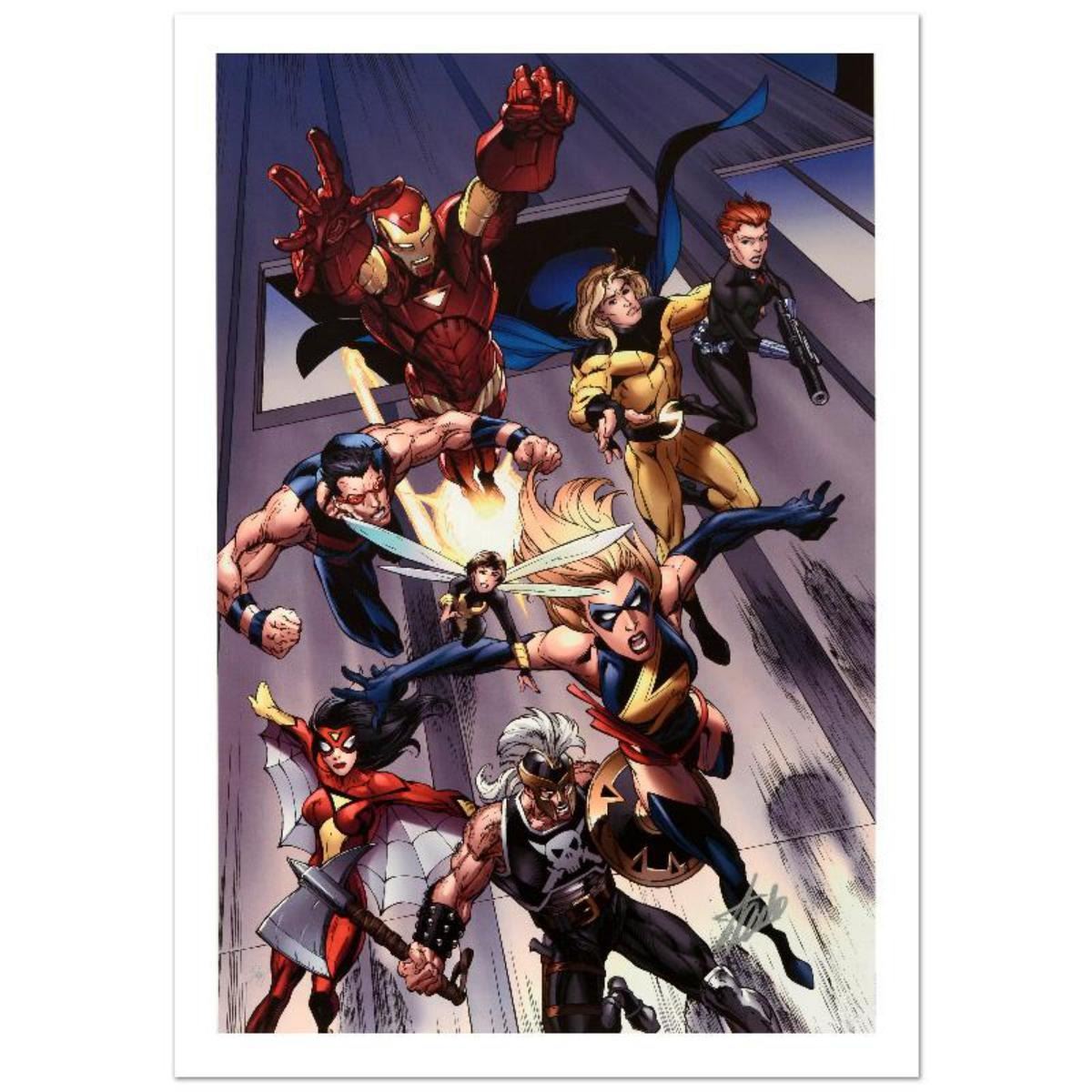 A piece of comic book history, this limited edition, from original art by Mark Bagley, depicts classic Marvel characters such as Ms. Marvel, Wasp, Spider Woman, Black Widow and Iron Man. Mark Bagley got his start by winning Marvel's Try-Out contest, for which he was awarded penciling jobs. Soon, Bagley was drawing regularly for the renowned Spider-Man franchise. "The Mighty Avengers #7" is a limited edition giclee on canvas by Mark Bagley presented by Marvel Comics, numbered and hand signed by the Great Stan Lee (1922-2018)! Includes Certificate of Authenticity! Measures approx. 18" x 27" (image). Reference #: 186643.