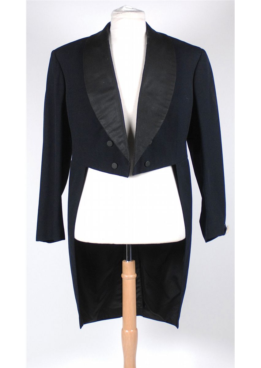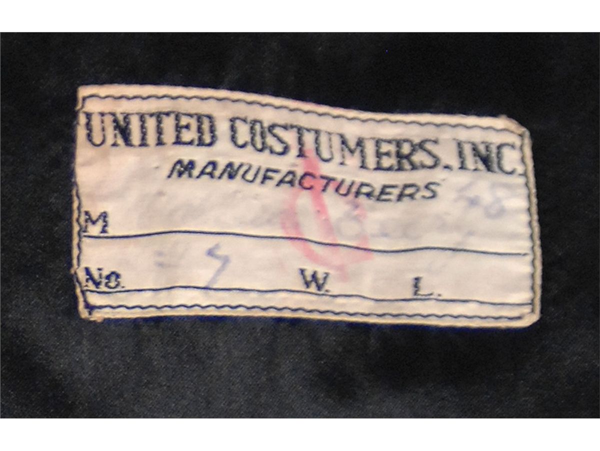Tuxedo jacket worn by Beery in the 1934 film The Mighty Barnum. Black tuxedo tailcoat has two rows of three buttons and a United Costumers Inc. tag sewn into the lining with Beery’s name written on the first line. In fine condition. Accompanied by a screen-capture of Berry in the jacket.
