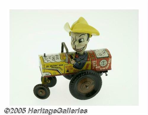 <B>The Milton Berle Car with Box (Marx, 1950s).</B></I> Join Uncle Miltie as he brings you hours of fun with this Marx tin lithographed wind-up funny car. The colorful original box is also included. Toy is all tin litho, except for Berle's plastic cowboy hat. The body of the car is decorated with various phrases and sayings such as "Whirl With Berle," "Oh Milton! You're Wonderful!," and "Tele Vis Super Super". Toy has some tiny scattered paint nicks, otherwise remains bright and glossy. Measures 3.5" x 6" x 6.25" with built-in key. The box is nicely illustrated on all sides, and includes illustrations of the toy on the front and back, and Berle in front of a microphone on two side panels. The box has light wear, several light creases, and several small tears, but remains tight, with bright colors and all flaps present. <I>From the Larry Jacobs Collection.</B></I>