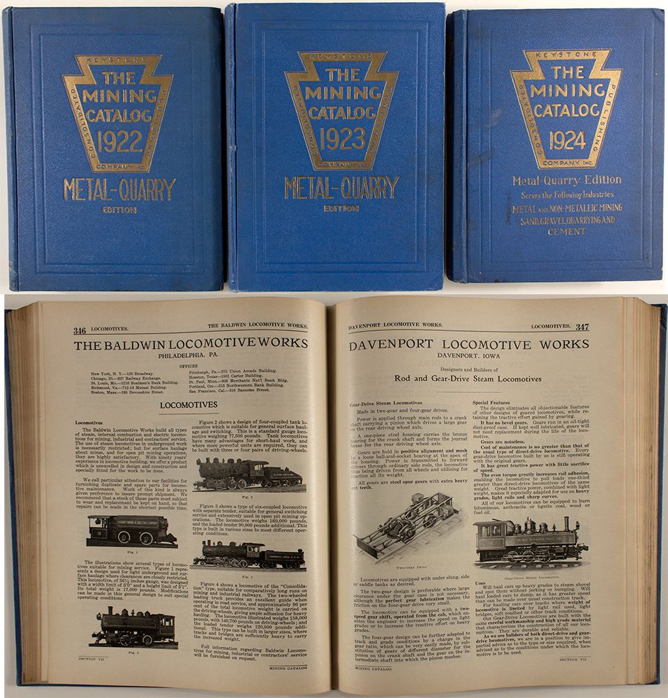 Lot of 3: 1922, 1923, 1924. Blue covers. Keystone Consolidated Publishing Company Inc., Pittsburgh, PA. General index (by categories), an alphabetical index of sections, an index to Engineering Data, an alphabetical list of firms catalogued, and an index of products. Sections discussing seemingly every aspect of mining: geological definitions, exploration, timbering, explosives and blasting, smelting, assaying, etc. Lots of pictures and diagrams. 1)Second Issue. 1922. 832 pages. 2) 1923 edition. 964 pages. 3) 1924 edition. Smaller size. 968 pages. Condition: very good overall. Minimal wear to covers. Toning to outer edges. Unbelievable source of information about mining equipment in the 1920s. Rarity: [i]