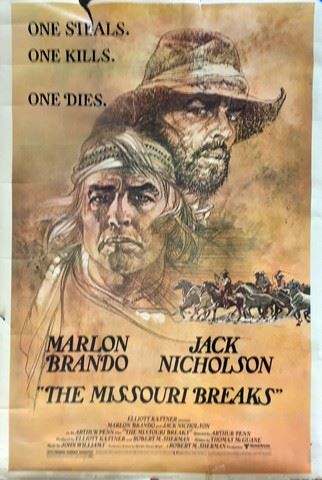 The Missouri Breaks (United Artists, 1976). One Sheet. Starring: Marlon Brando and Jack Nicholson. There are creases, pin holes, paper loss, starins and edge wear damage. Fine. (36.5" X 59").