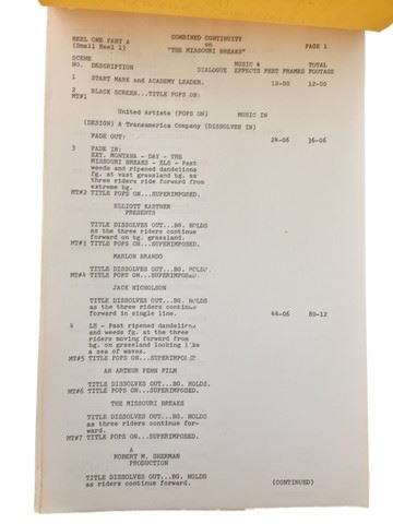 "The Missouri Breaks" (1976) from United Artist original script and combined continuity. When vigilante land baron David Braxton (John McLiam) hangs one of the best friends of cattle rustler Tom Logan (Jack Nicholson), Logan's gang decides to get even by purchasing a small farm next to Braxton's Ranch. Also starring Marlon Brando as Lee Clayton, Kathleen Lloyd as Jane Braxton, Randy Quaid as little Todd, and Harry Dean Stanton. Marlon Brando's performance in this film was mostly improvised, the director gave up on him and just decided to let him act whatever way he wanted. (Approx. 14"x9").