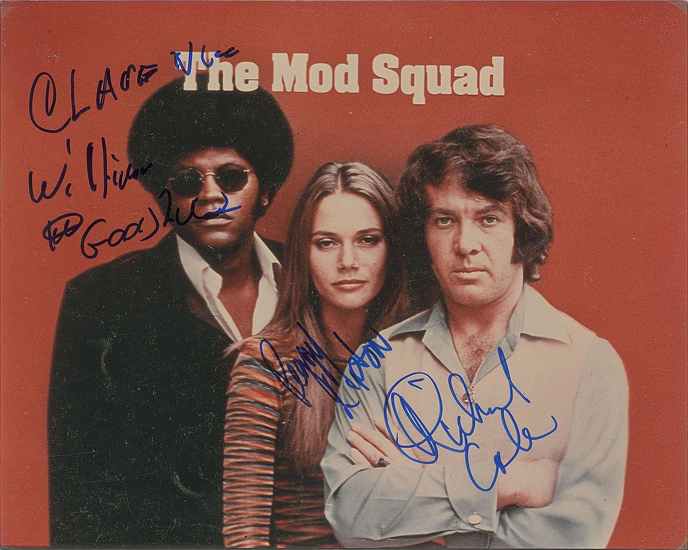 Color glossy 10 x 8 half-length photo of the cast from The Mod Squad, signed in blue felt tip, "Clarence Williams III, Good Luck," "Peggy Lipton," and "Michael Cole." In fine condition, with light creasing and scuffing.