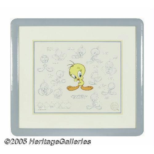 <B>The Model Series: Tweety Bird Limited Edition Hand-Painted Cel #329/500 (Warner Bros., 1991).</B></I> This hand-painted limited edition animation cel was produced by the Bob Clampett Animation Art studio using the same methods employed in preparing cels for actual production. The pose was adapted from director Bob Clampett's original character models and animation, and the background lithography was printed on a premium stock. This art measures 16"" x 13,"" and is in Excellent condition. Includes a certificate of authenticity. <BR><BR><B>Important notice:</B> Heritage usually auctions material at the rate of 200-250 lots per hour. On some occasions eBay Live bid software or the Internet may not be able to keep up with the pace of the auction. We recommend placing a realistic absentee bid now as insurance to avoid disappointment. Occasionally the auctioneer may eliminate or reject an eBay Live bid, and the auctioneer may also reopen a lot after the close of the eBay live bidding (usually because we missed an audience bid), and may reject your bid even if it shows you as the winning bidder. By bidding via eBay Live, you agree that Heritage may award the lot to another bidder at its sole discretion under the circumstances described above or any other reasonable circumstances. Since eBay bids are not shown to us until we open the lot on the floor, we treat those bids just like floor bids. In most cases the floor responds before the eBay bid is presented to us, due to Internet lag time, so for consistency we have made it a policy that floor bids are always considered first over tie eBay live bids. Also please note that all Heritage lots purchased through eBay Live carry a 20% Buyer's Premium. Please make sure you read the Terms and Conditions before you bid. This lot is being auctioned in conjunction with a live floor auction by Heritage Galleries & Auctioneers. All final auction and invoice information will be supplied by Heritage Galleries & Auctioneers, and all oth
