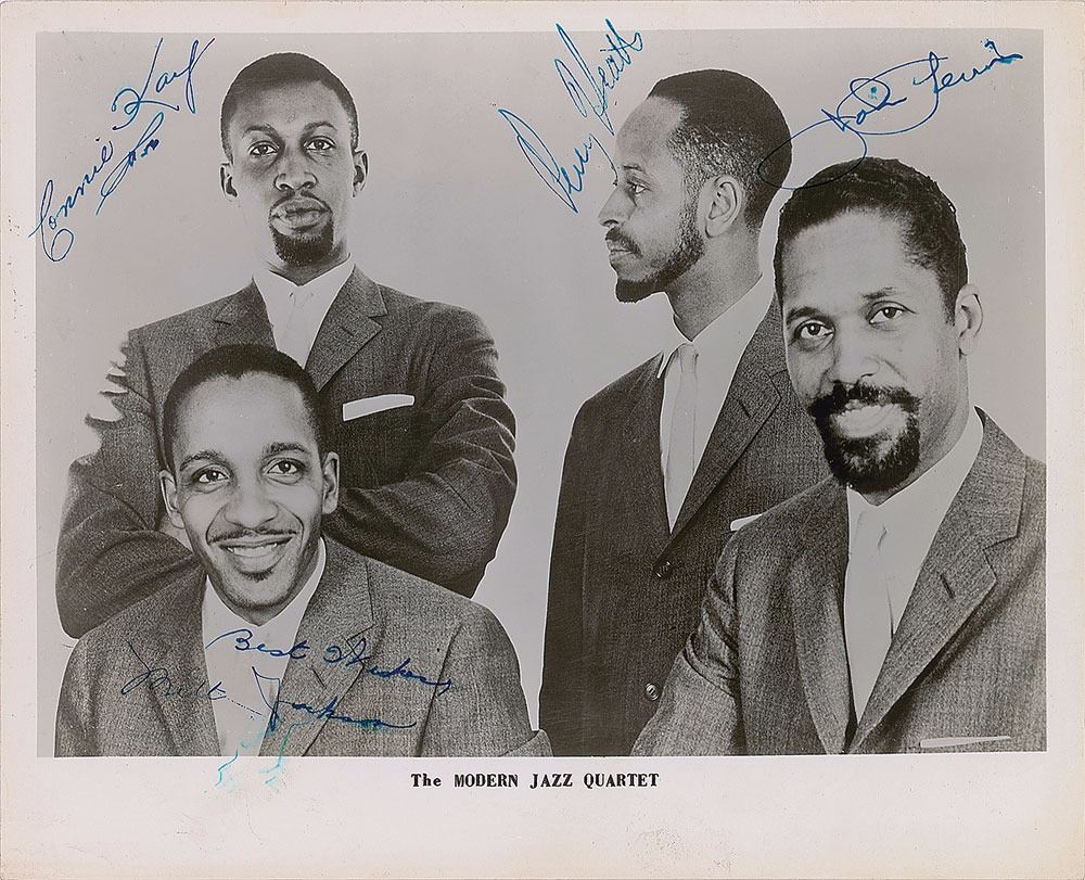 American jazz combo established in 1952 that played music influenced by classical, cool jazz, blues and bebop. Vintage glossy 10 x 8 publicity photo of the Modern Jazz Quartet, signed in blue fountain pen, "Best wishes, Milt Jackson," "Percy Heath," "John Lewis," and "Connie Kay." In fine condition, with scattered light creasing.
