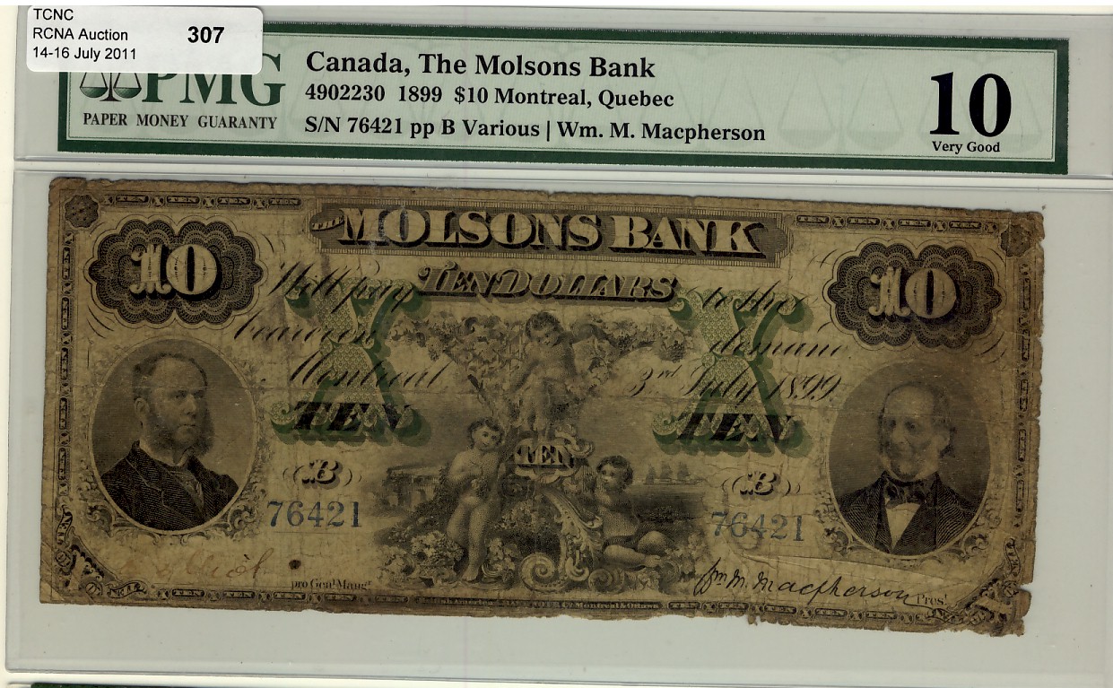 The Molsons Bank 1899 $10 76421 CH-490-22-30 PMG VG10