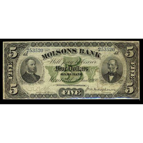 The Molsons Bank 1900 $5 CH-490-22-18 No.253520 F+, scarce in this condition.