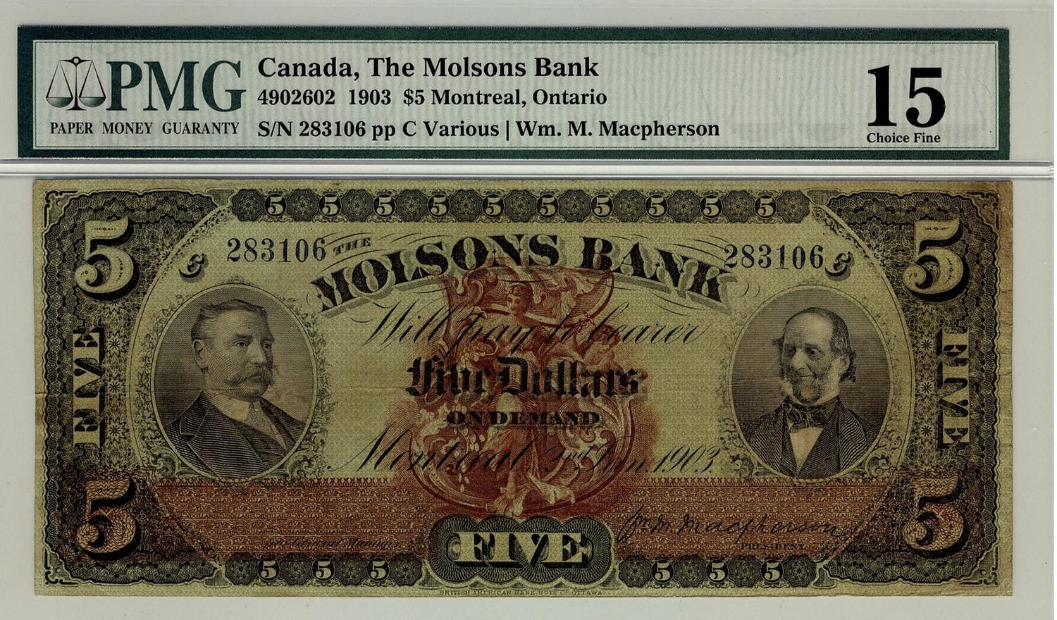 The Molsons Bank,1903 $5 #283106, CH-490-26-02, PMG F15. Blue serial #, tied for finest graded. Truly underrated and very rare.