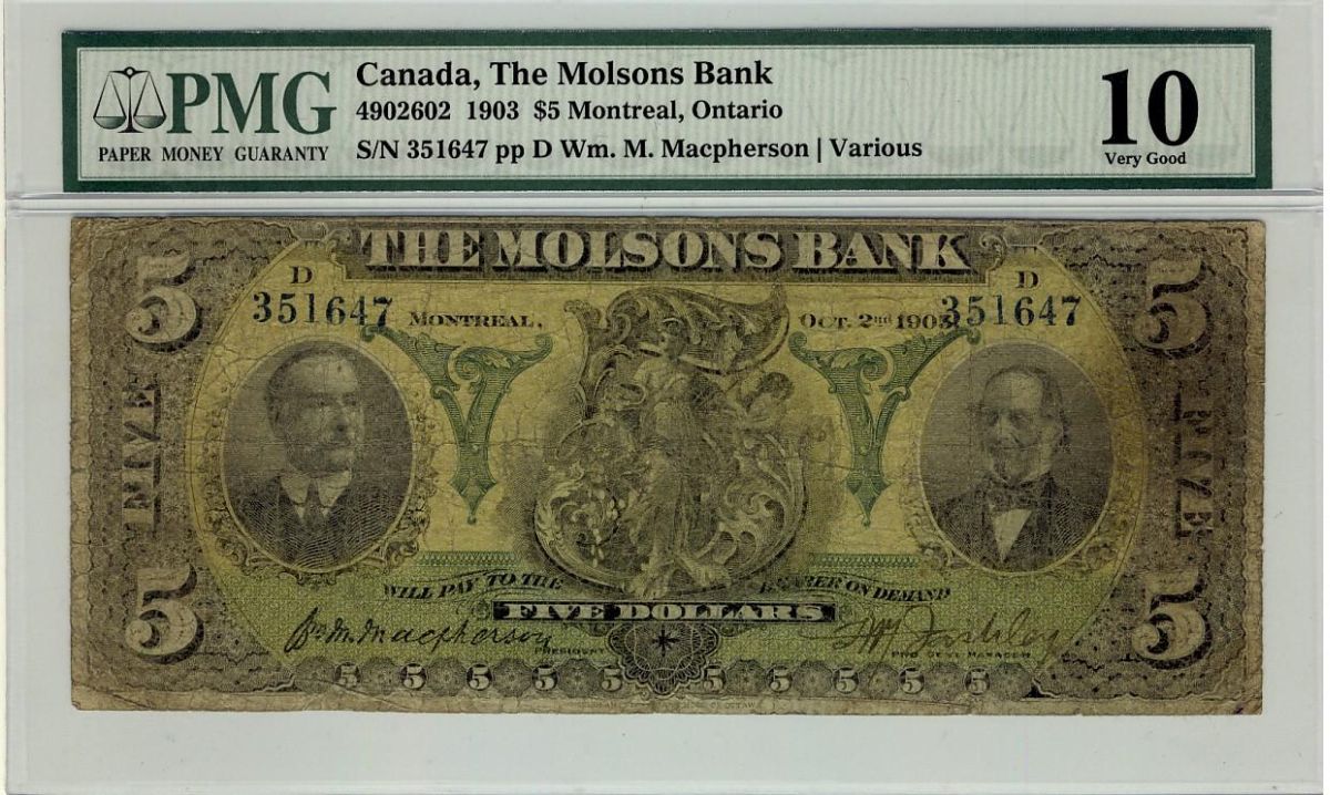 The Molsons Bank, 1903 $5 #351647 CH-490-26-02. PMG VG10.