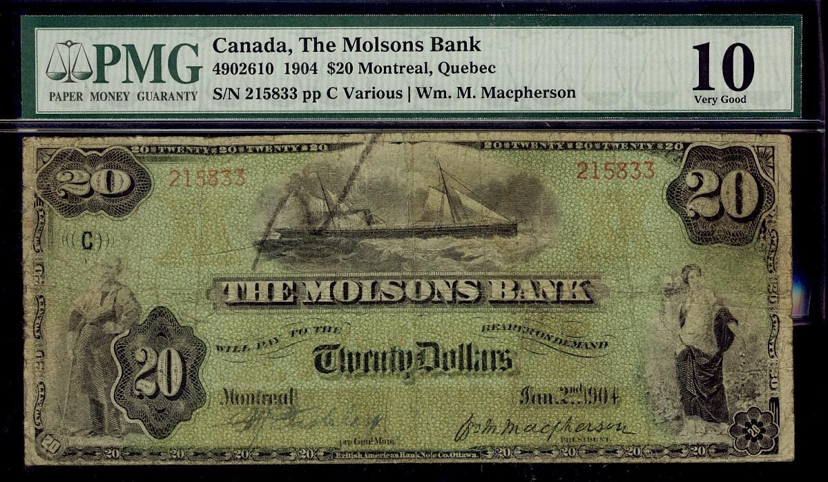 The Molsons Bank 1904 $10 #215833 CH-490-26-10 PMG VG10.