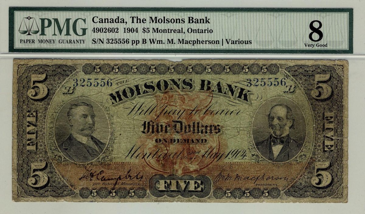 The Molsons Bank,1904 $5 #325556, CH-490-26-02, PMG VG8. The only example graded by PMG. Excessively