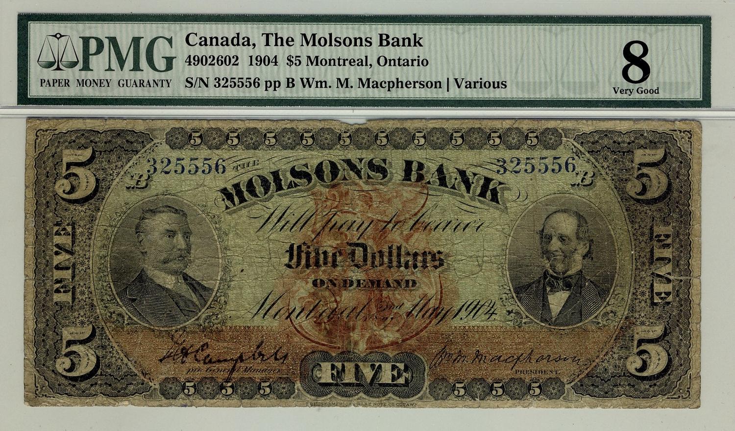 The Molsons Bank,1904 $5 #325556, CH-490-26-02, PMG VG8. The only example graded by PMG. Excessively scarce.