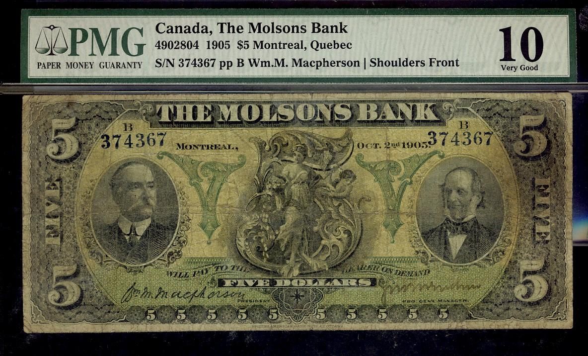 The Molsons Bank 1905 $5 #374367 CH-490-28-04 PMG VG10.