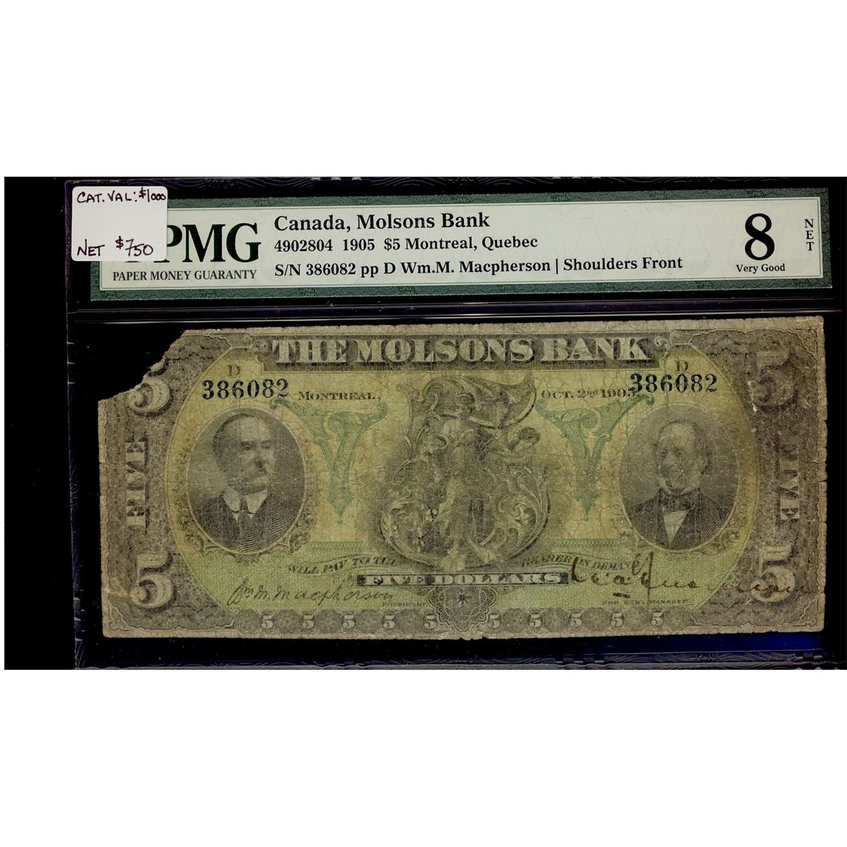 The Molsons Bank 1905 $5 #386082 CH-490-28-04 PMG VG8.