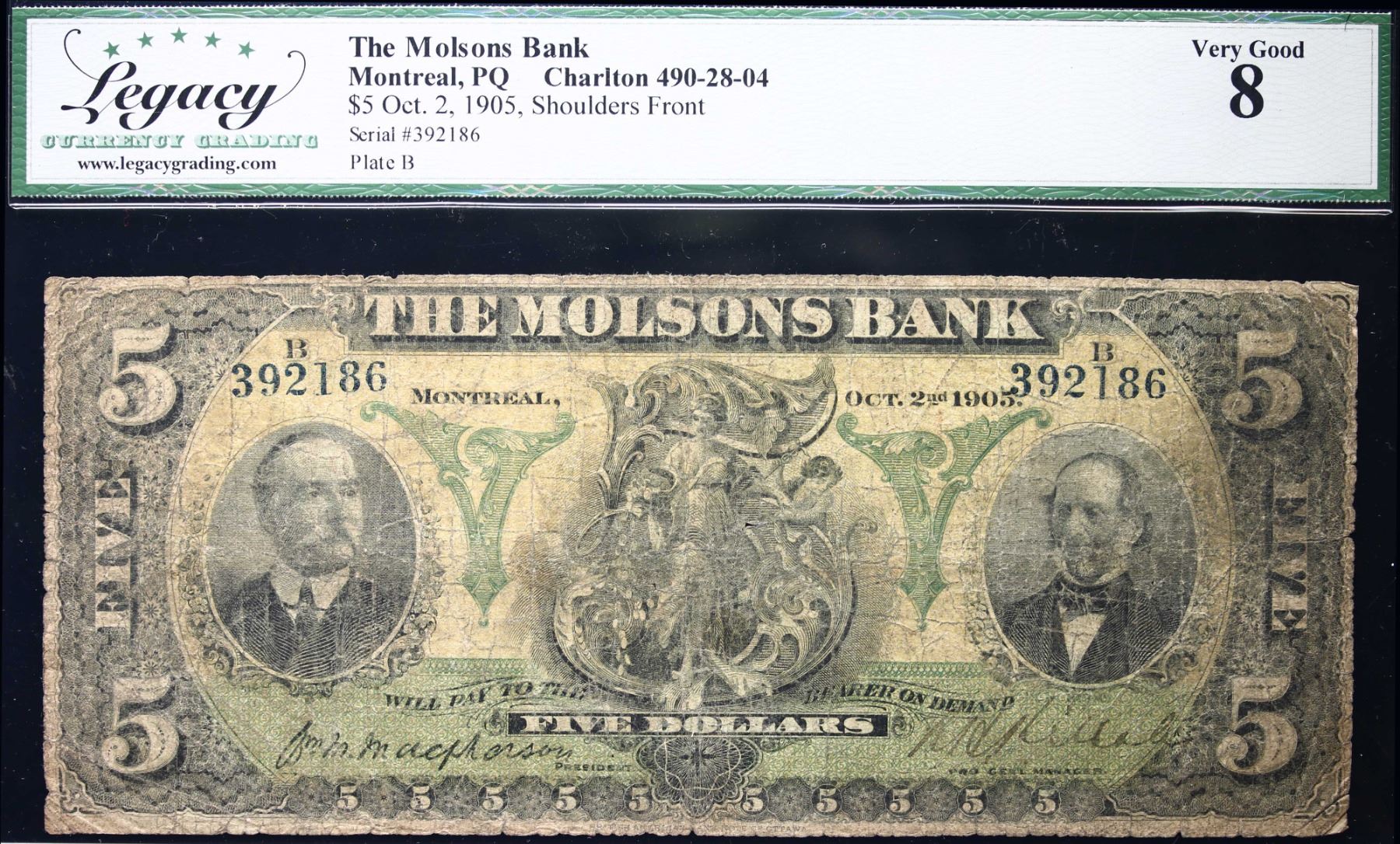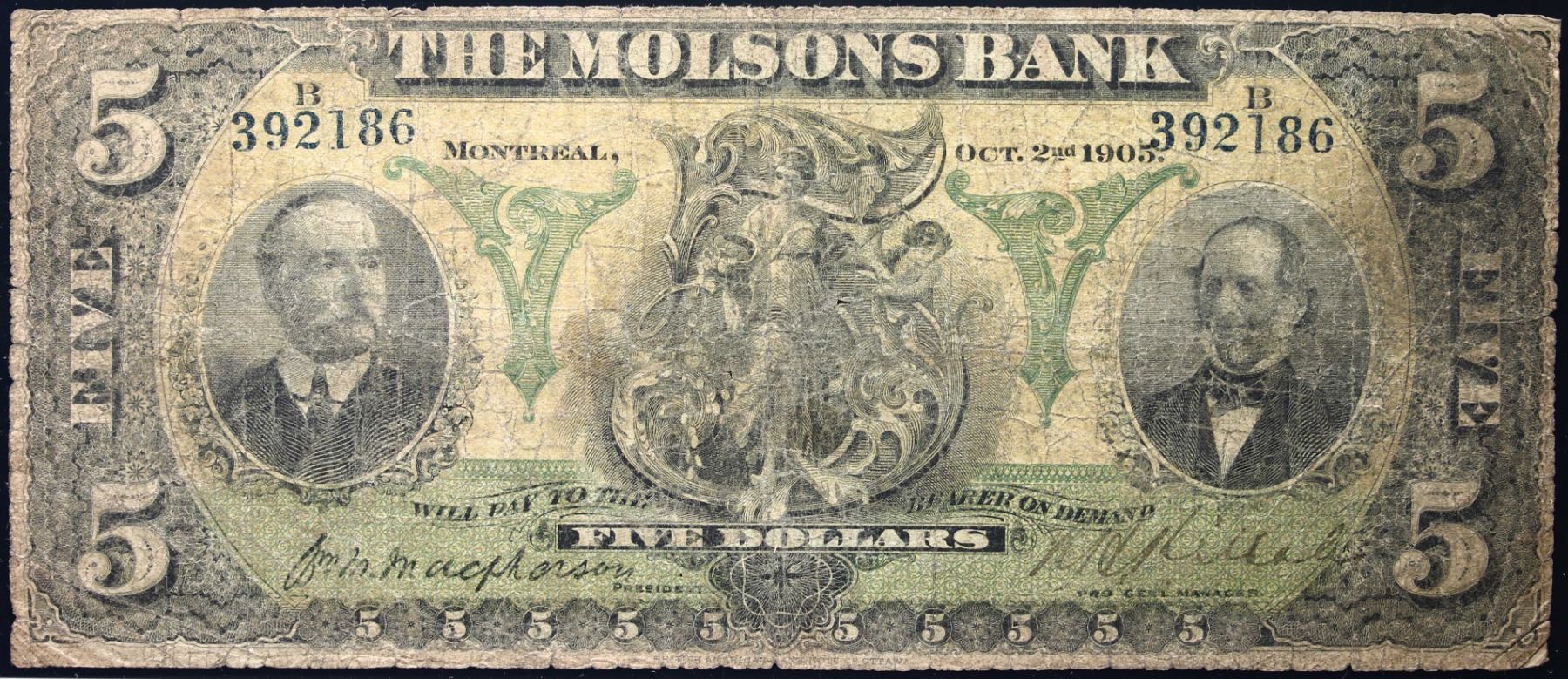 The Molsons Bank 1905 $5 CH-490-28-04 #392186 LCG Very Good-8