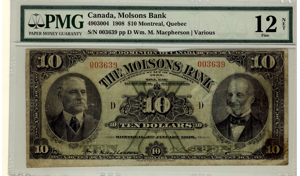The Molsons Bank 1908 $10 003639 CH-490-30-04 PMG F12