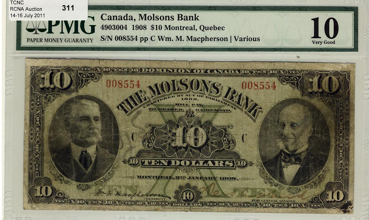 The Molsons Bank 1908 $10 008554 CH-490-30-04 PMG VG10