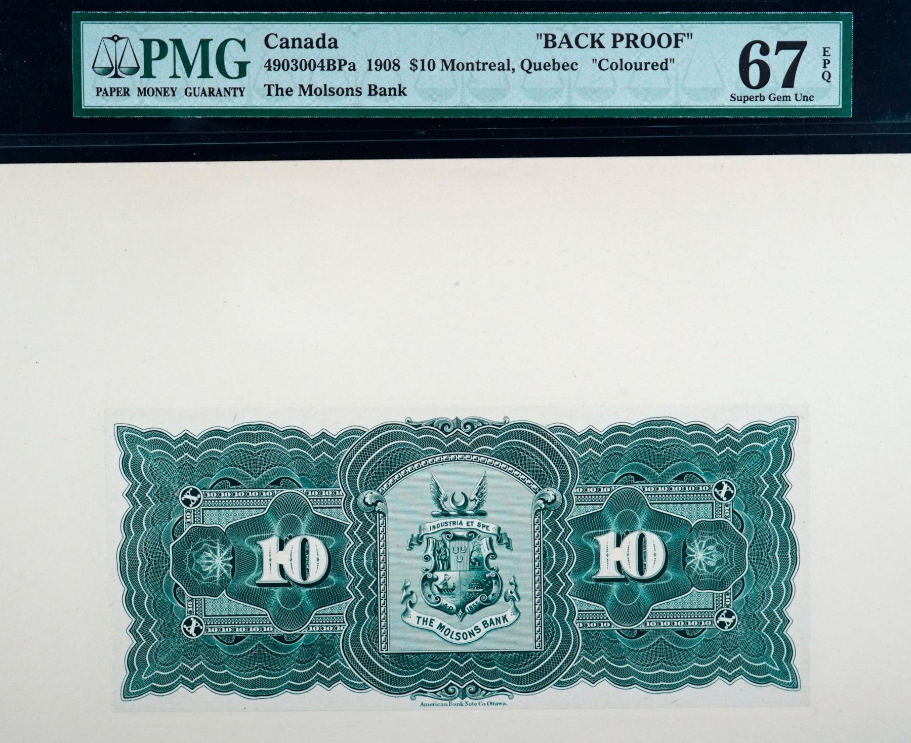 The Molsons Bank 1908 $10 "Back Proof" Coloured - CH-490-30-04BPa PMG Superb Gem Uncirculated-67EPQ