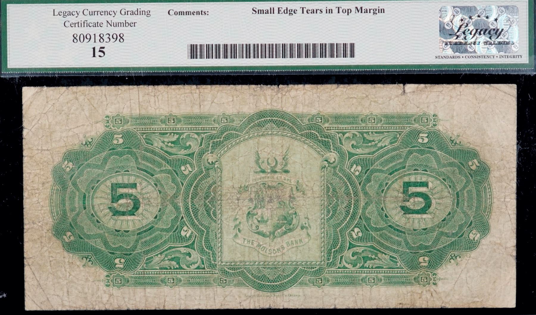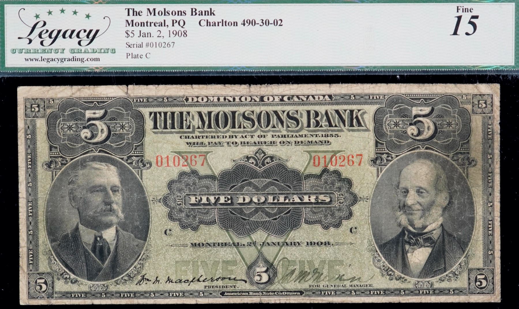 The Molsons Bank 1908 $5 #010267 CH-490-30-02 Legacy Currency Grading Choice Fine-15 minor tear