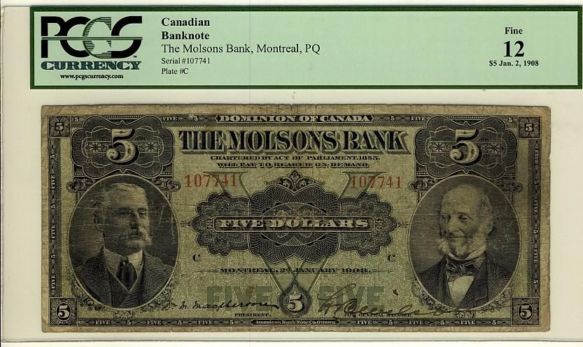 The Molsons Bank, 1908 $5 #107741, CH-490-30-02, PCGS F12