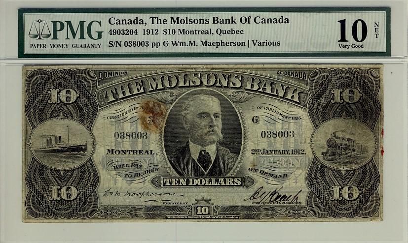 The Molsons Bank, 1912 $10 #038003, CH-490-32-04, PMG VG10. Seldom offered.