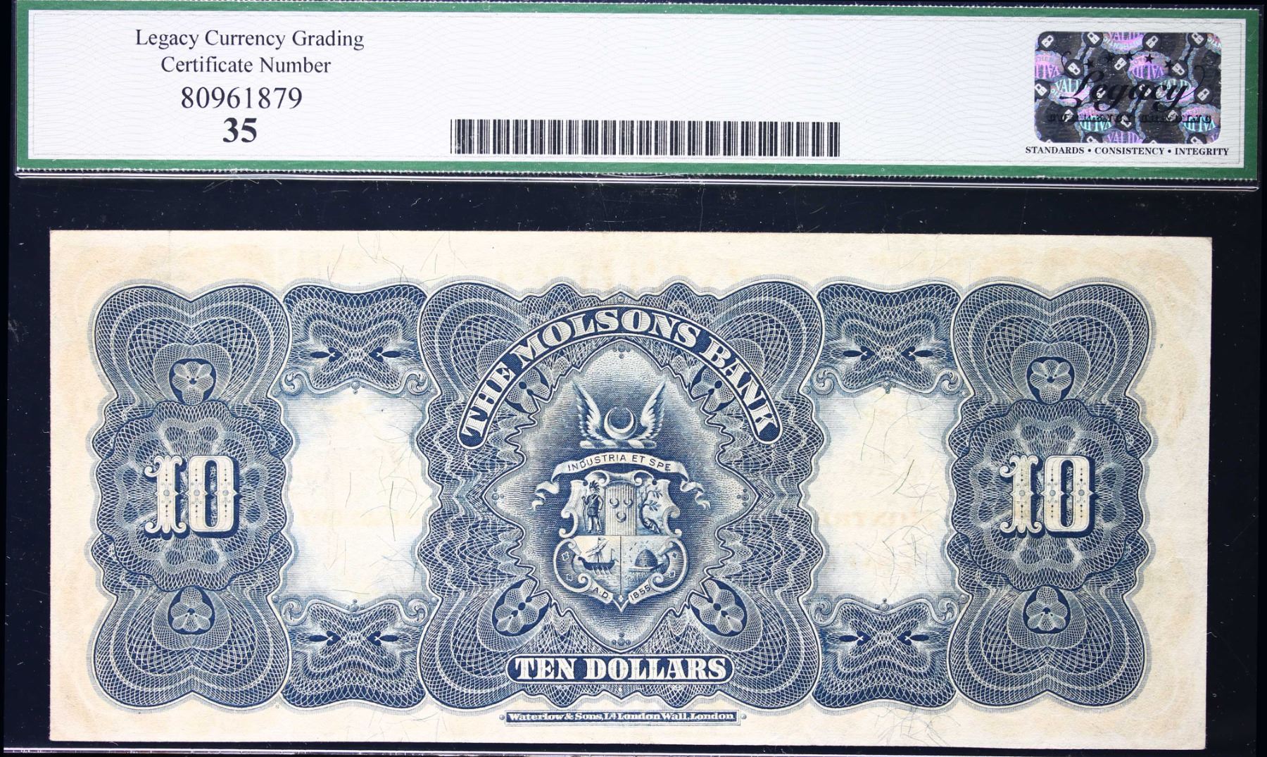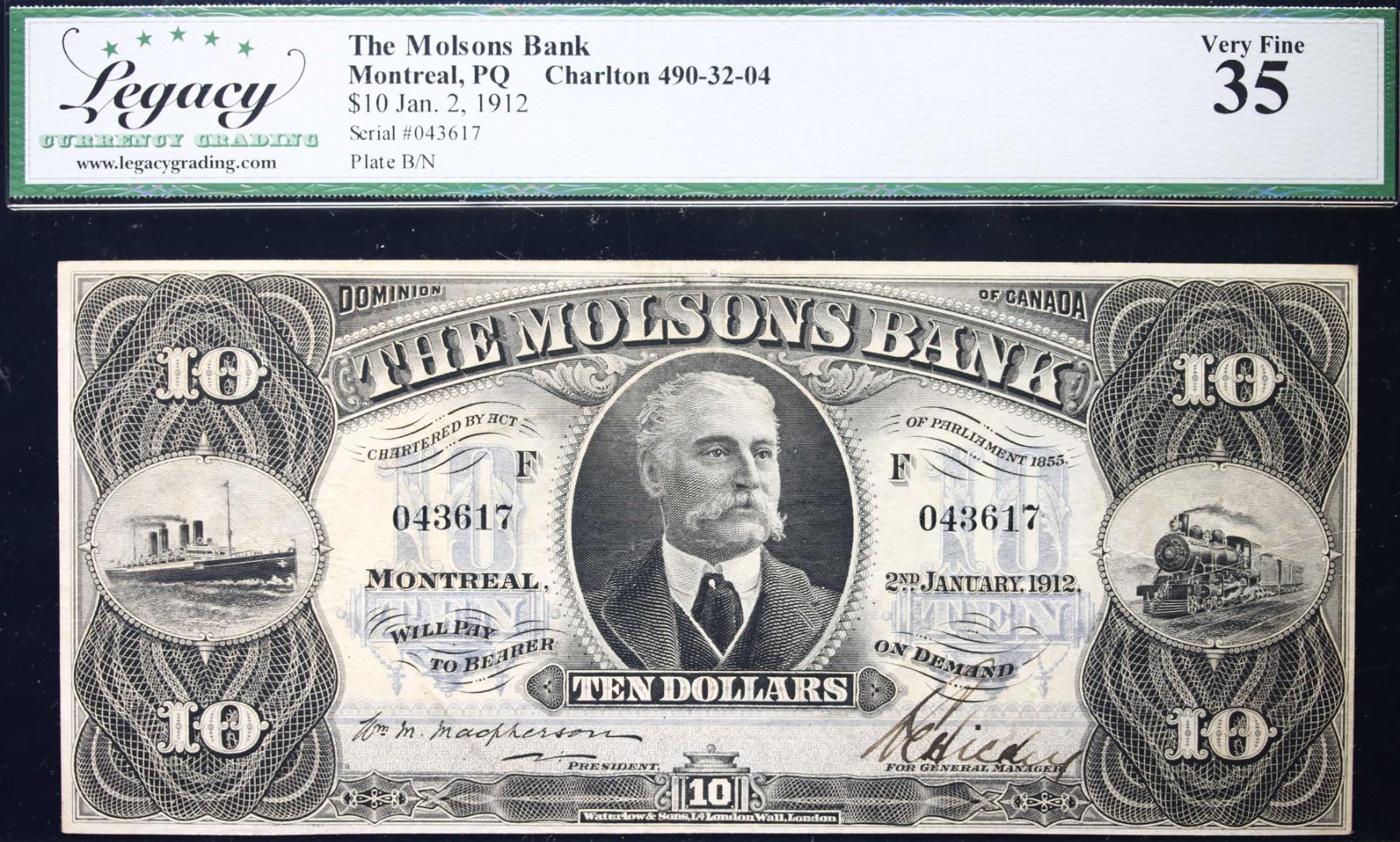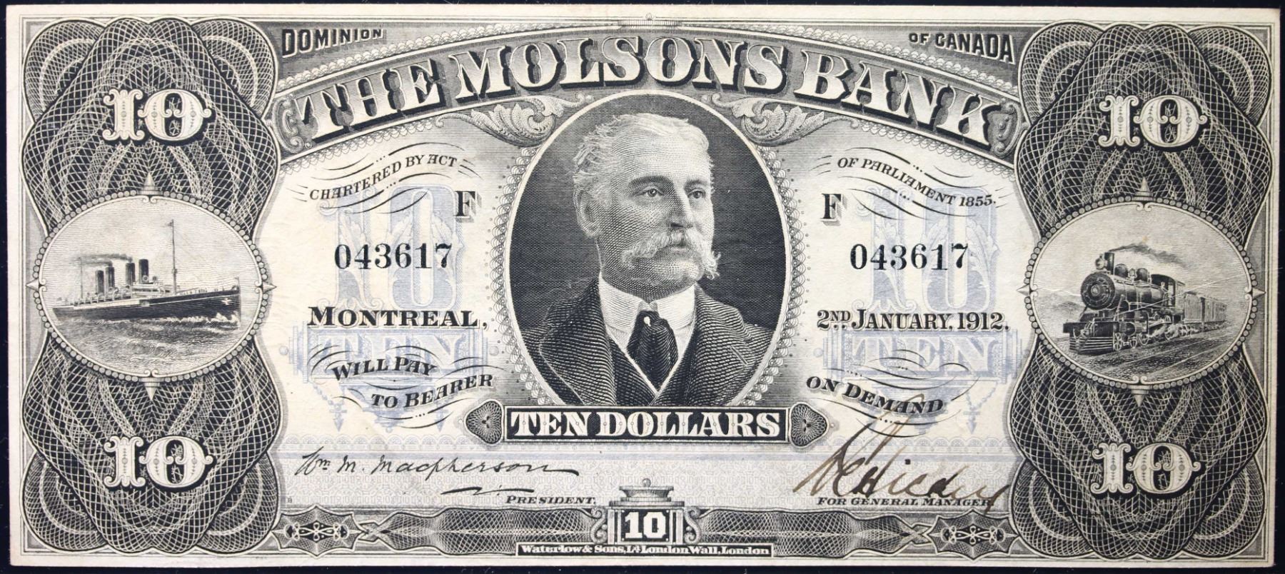 The Molsons Bank 1912 $10 CH-490-32-04 #043617 LCG Choice Very Fine-35. A very nice and pleasing example. Seldom seen in this condition.