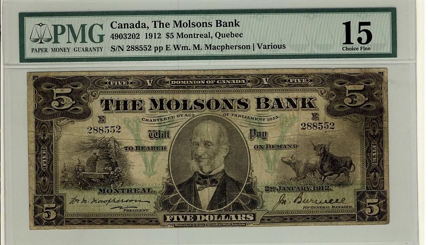 The Molsons Bank, 1912 $5 #288552, CH-490-32-02, PMG F15
