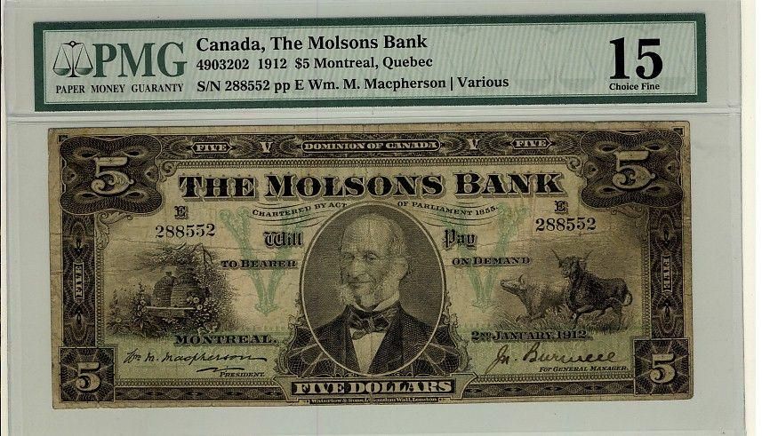 The Molsons Bank, 1912 $5 #288552, CH-490-32-02, PMG F15