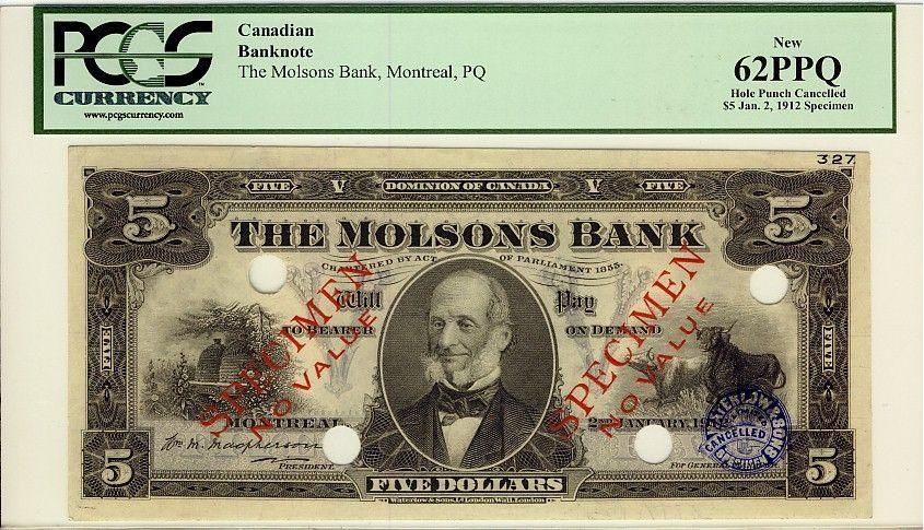 The Molsons Bank, 1912 $5 SP, CH-490-32-02S, PCGS UNC62PPQ