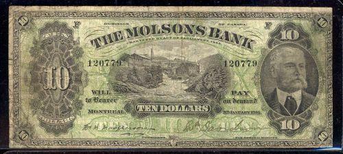 The Molsons Bank 1916 $10 120779 CH:490-36-02 Fine . A very popular Bank!